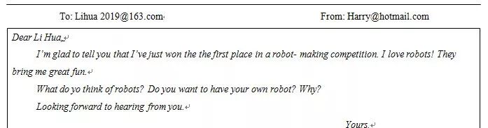 假定你是李华,收到英国笔友 Harry 的邮件,获悉他在机器人制作比赛中获奖。请根据邮件内容给他回复。词数 80 左右。
