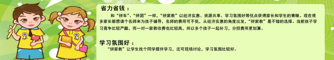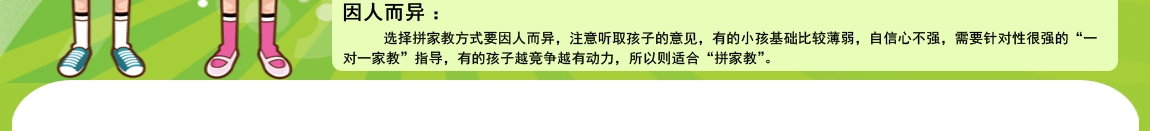 有关专家表示,多个学生共同学习,从某种角度来说,确实能够调动学生主动学习的兴趣。他们可以在一种轻松的环境下共同交流和学习。但是也要注意其有不容忽视的劣势,一个老师教两三个小孩,可能没有“一对一”针对性那么强,同时兼顾不了几个小孩。此外,家长本来就爱攀比孩子的学习成绩。几个孩子一起学习,家长可能会给孩子施加更大的压力,导致孩子产生抵抗情绪甚至破坏友谊。“拼家教”这种形式还比较受家长认可,但并不一定对每个小孩都合适。在此,专家提醒广大家长,选择家教方式也要因人而异,注意听取孩子的意见,有的小孩基础比较薄弱,自信心不强,需要针对性很强的“一对一”指导,有的小孩越竞争越有动力,则适合“拼家教”。 |